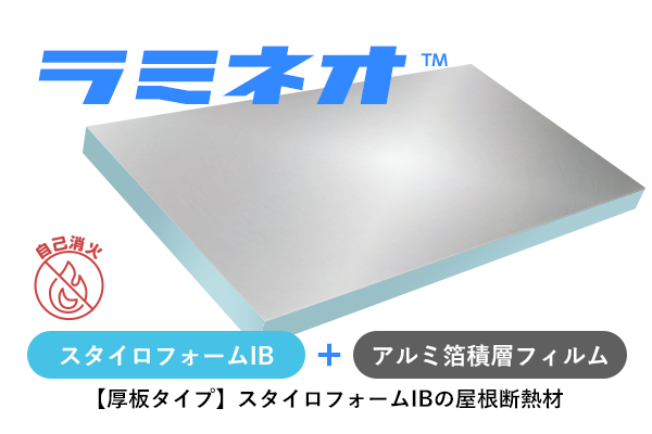 芯材であるスタイロフォームIBの断熱性能はそのままに、アルミ箔フィルムをラミネートすることにより、遮熱効果をもたせました。